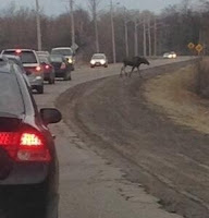 Shortly before 7:30am 1310News Ottawa received a report of a moose on the loose at Lester Road just west of Albion Ottawa. Listener Jennifer Fallowfield sent the news station a pic of the moose spotted on Lester, showing a line of stopped traffic waiting for the moose to finish crossing the road. Apparently Moose on Ottawa area roads are not as uncommon as you might think. Ed Hand of 1310 saw one back in January on Conroy near Bank. Since Moose do an excellent job, naturally slowing traffic, perhaps Omemee could import a pair to patrol the streets in the early morning hours.